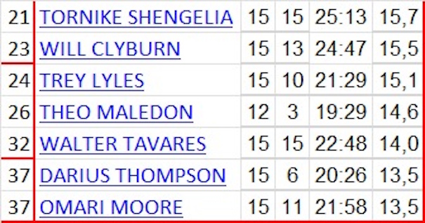 Un (21) Clyburn que ocuparía la Posición 23 (que sería el Vigesimotercero) entre esos 227 Jugadores, un (21) Clyburn al que seguiría el MVP del Madrid en estas 15 Primeras Jornadas, el (También) ex-NBA (0) Trey Lyles, con 15.1 de Media por Partido en los (También) 15 Partidos que ha disputado, formando parte de 10 de sus Quintetos Iniciales.