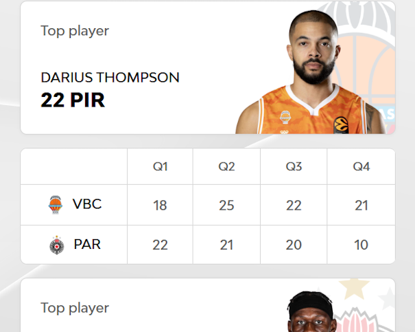 En un Partido cuyo MVP (aunque No fuera el Jugador con la Mayor Valoración del Partido) era el No Inicial ex-NBA (13) Darius Thompson (con Pasaporte de la República -parlamentaria– Italiana, por Matrimonio), con 22 de Valoración, siendo el Tercer Jugador del València que es su MVP en 5 o Más de esos 32 Primeros Partidos y el Segundo de esos 3 Jugadores que lo es en 4 o Más Victorias.