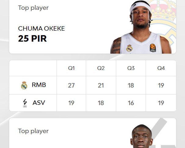 En un Partido en el que conseguía su Segunda Victoria en esta Décima @EuroLeague “de Todos contra Todos” (y Cuarta de sus 6 Primeros Partidos de la Temporada, Tercera Consecutiva, las 3 como Equipo Local), por 85 a 72 (+13), en un Partido cuyo MVP era el No Inicial (y También) ex-NBA (8) Chuma Okeke, con 25 de Valoración, con la Mayor Valoración de Jugador alguno del Madrid en sus 6 Primeros Partidos de la Temporada.