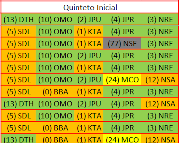 40 Quintetos Iniciales en los que hemos visto a un Total de 34 Jugadores Distintos (12 en los 14 Quintetos Iniciales de los 14 Partidos del València, otros 12 en los También 14 Partidos del Madrid y 10 en los 12 Partidos del Barcelona), habiendo Sólo 2 Jugadores (Ambos del Madrid) que han ocupado 2 Posiciones Distintas en esos Quintetos Iniciales.